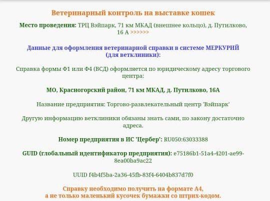 На выставке будет ветконтроль. Всем участникам необходимо иметь при себе справки формы 1 для иногородних и формы 4 для жителей г.Москвы.